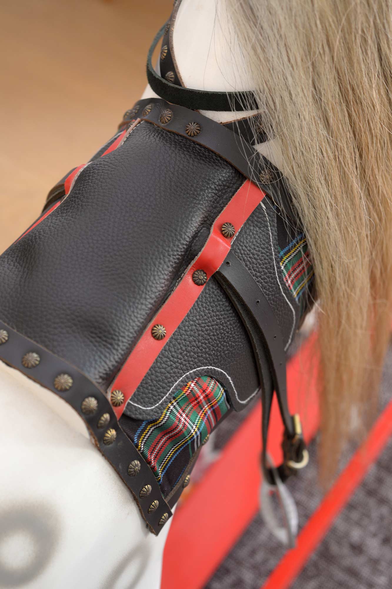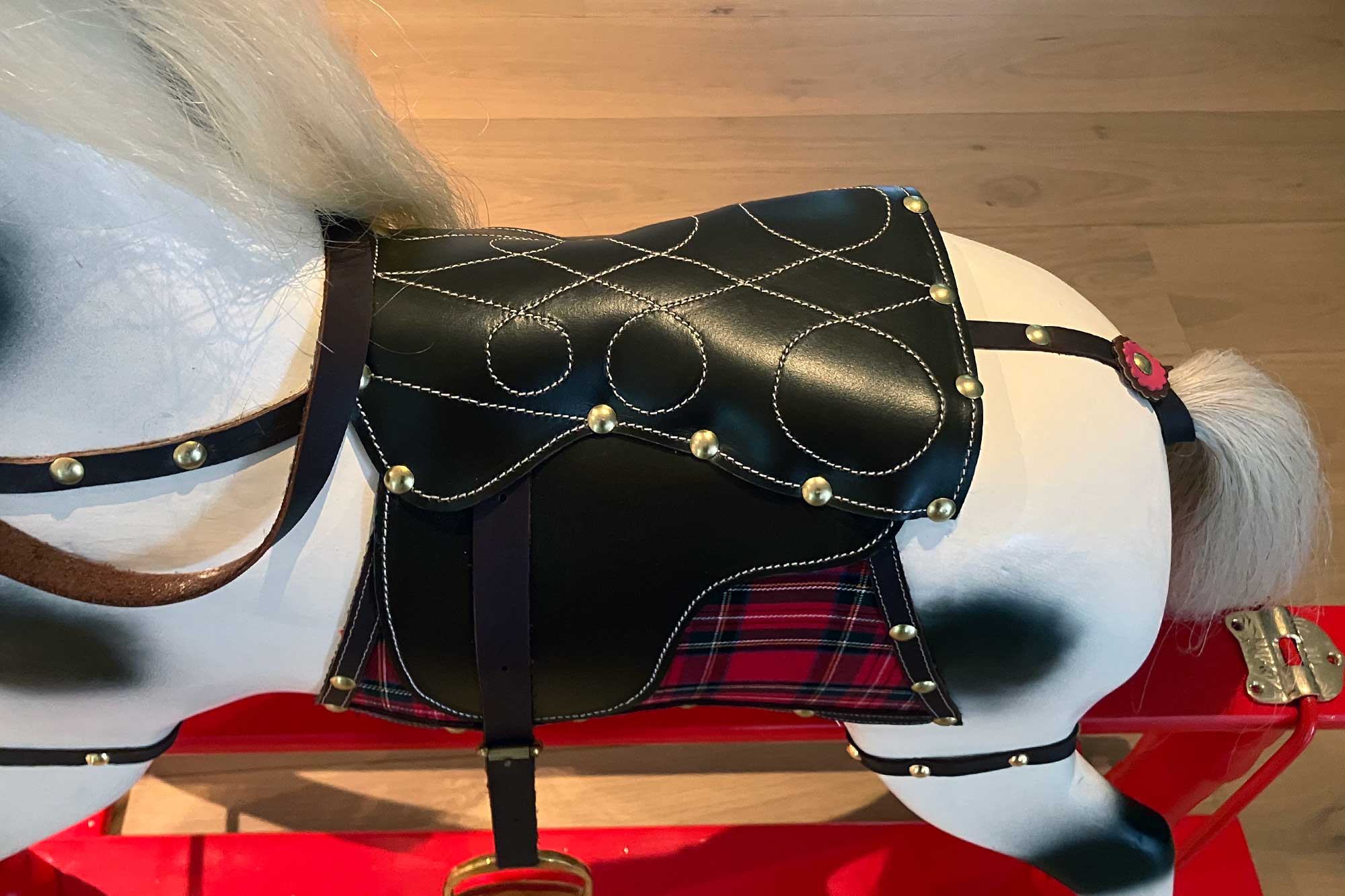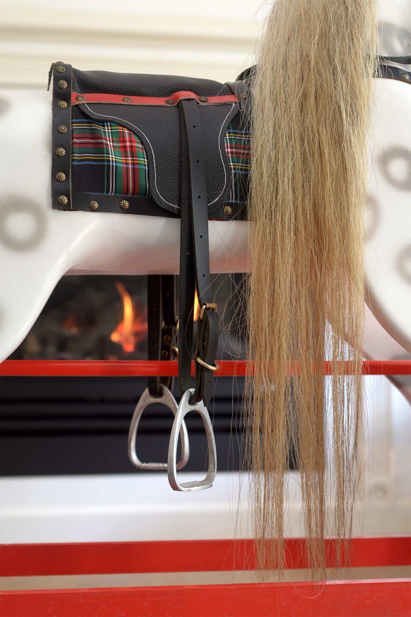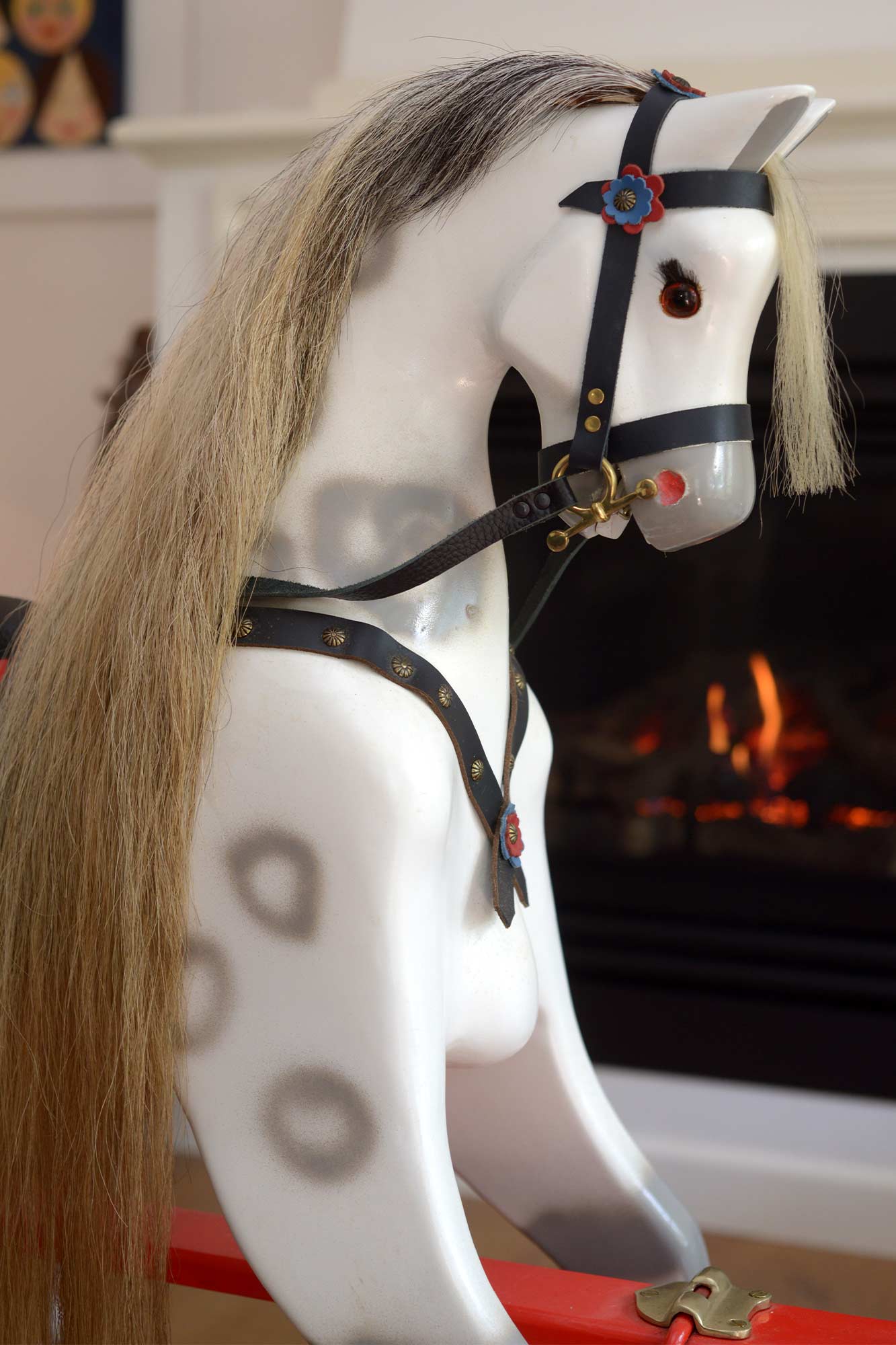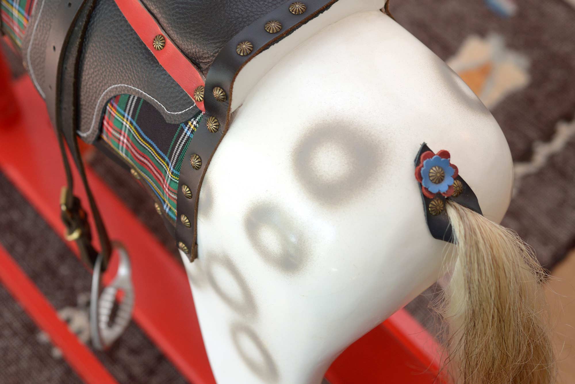 Stephen is a specialist in vintage rocking horse restoration. On the horse itself, repairs are made to broken or cracked limbs, head, neck or other joints. To make the horse safe for use, toxic lead-based paint is removed and replaced with numerous coats of primer and finish coats of premium lead-free paint imitating its original decoration. It is then finely detailed with a traditional tartan saddle blanket with leather trim, and all-new leather strapping bridle, reins and saddle and new aluminium stirrups. Like the originals, Stephen uses real horsehair for manes, tails and forelocks.