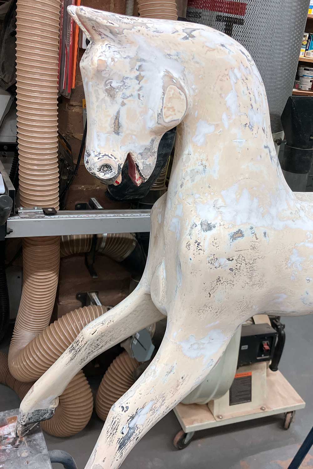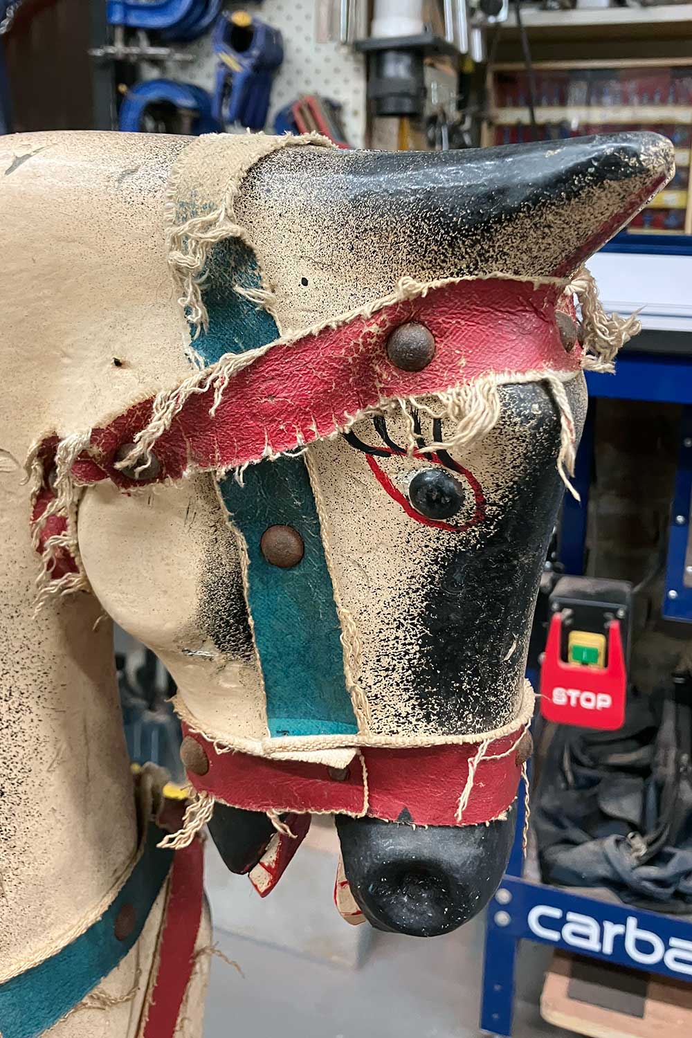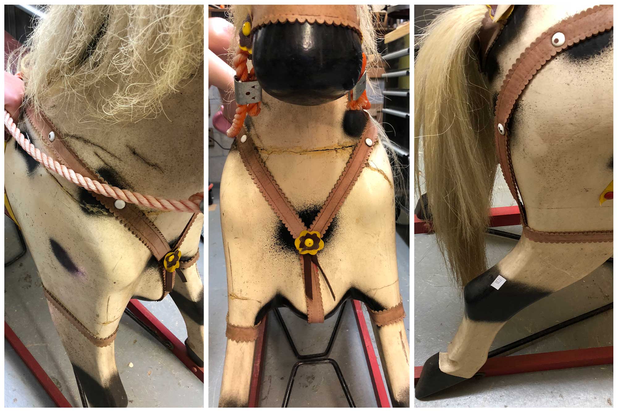 These heirloom rocking horses often arrive from clients in very poor condition: peeling paintwork, split and cracked timber, missing parts.